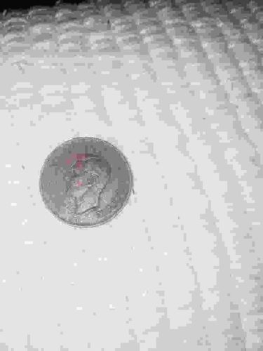 This item is a United States five-cent coin, commonly known as a Jefferson Nickel. The obverse side features a left-facing profile portrait of Thomas Jefferson, originally designed by Felix Schlag. The coin appears to be made of a standard cupro-nickel composition (75% copper, 25% nickel). Based on the profile style, it is likely a specimen minted between 1938 and 2004, prior to the 'Westward Journey' redesigns. The coin is circular with a smooth edge and a diameter of approximately 21.21 mm. The visible condition shows significant wear and circulation marks. There is a notable red or pinkish stain or mark across the upper portion of Jefferson's head, which appears to be post-mint damage (possibly ink, paint, or a chemical reaction) rather than a mint error. The surface exhibits several small scuffs, surface scratches, and a dulling of the original mint luster, consistent with a coin that has seen extensive time in circulation. The high points of the portrait, such as the hair and cheekbones, show flattening. No specific date or mint mark is clearly legible due to the image resolution and surface wear, but the overall strike quality appears standard for a business-strike utility coin. The coin is resting on a textured, off-white fabric surface, possibly a knitted or woven material, which provides a sense of scale.