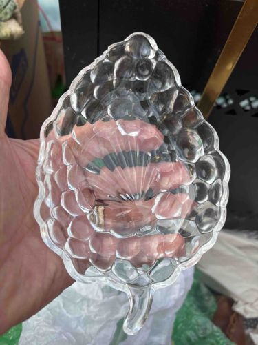This is a vintage serving dish or trinket bowl fashioned in the representational shape of a grape cluster. The item is constructed from thick, clear pressed glass, featuring a characteristic textured 'bumpy' exterior that mimics individual grapes. The interior is polished and relatively smooth to allow for contents, while the reverse side showcases deep molded indentations providing a tactile, high-relief effect. The dish includes a curved glass handle at the base, designed to represent the stem of the vine. In terms of dimensions, the piece appears to be approximately 5 to 7 inches in length, fitting easily within a human palm. The glass exhibits good clarity with a bright, refractive quality, though common for this era of pressed glass, slight production bubbles or faint mold seam lines may be present. The scalloped edges undulate to follow the silhouette of the fruit. Based on the style and heavy mold work, this likely dates to the mid-20th century (circa 1940s-1960s), a period when figural glassware for condiments, nuts, or candies was highly popular in American and European households. The condition appears excellent with no visible chips, cracks, or significant clouding, maintaining a high luster that indicates quality manufacturing and careful preservation.