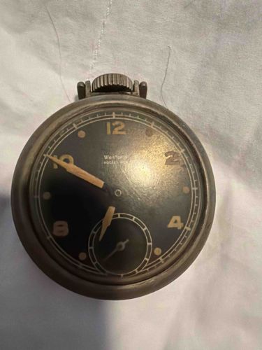 This is a vintage Westclox 'Pocket Ben' pocket watch, likely dating from the mid-20th century, specifically the 1940s to 1950s. The timepiece features a distinct military-inspired aesthetic with a matte black dial and contrasting cream or tan Arabic numerals and hands. The case appears to be a base metal, possibly nickel-plated or gunmetal finish, displaying significant age-related patina and surface wear. Notable features include a 'railroad track' minute scale around the perimeter and a sub-dial at the six o'clock position for tracking seconds. The hands are tapered and coated with what appears to be aged luminous material, which has acquired a dark, creamy patina over time. The crown at the twelve o'clock position shows deep serrations for grip, integrated with an arched bow. The crystal shows visible scuffing and scratches consistent with long-term use. The overall construction reflects the sturdy, utilitarian 'dollar watch' philosophy of Westclox, prioritizing functional reliability. The dial is marked with 'Westclox' and 'Pocket Ben' in modern block lettering, which helps narrow the manufacturing period. The condition is fair to good for its age, showing heavy honest wear but no catastrophic damage, making it a specimen of mid-century industrial horology.