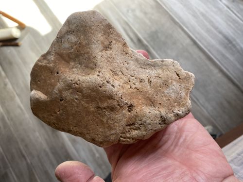 This specimen is a lithic artifact measuring approximately 5 inches by 4 inches, discovered in Guthrie, Oklahoma. It is constructed from chert, a hard, sedimentary rock known for its microcrystalline structure that allows for controlled fracturing. The object exhibits a distinctive sub-triangular or cordiform shape, characteristic of Lower Paleolithic stone tools such as hand axes or heavy-duty scrapers. The material displays a natural tan to light brown earthy coloration with a heavily weathered, pitted surface texture. Notable features include peripheral flaking and deliberate shaping along the margins, indicating percussion-based reduction. The surface shows significant patina and mineral buildup, consistent with long-term burial or environmental exposure. There are no modern tool marks or recent fractures visible; instead, the edges appear dulled and smoothed by time, suggesting archaic use as a cutting or scraping implement. The specific profile of the stone has been interpreted as 'portable rock art' representing a bird's head, which is a subjective zoomorphic identification often associated with early hominid symbolic behavior. The craftsmanship reflects a bifacial reduction technique where stone was removed from both sides to create a functional edge. Its condition is ancient and stable, with natural erosion and geological pitting across the dorsal and ventral faces, though the primary structural integrity remains intact. The artifact represents a piece of prehistoric technology used for processing hides or woodworking, potentially dating back to the earliest human inhabitants of the North American Plains.