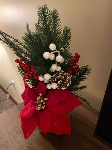 This item is a decorative artificial floral arrangement designed for holiday or winter seasonal use. The central focal point is a large red fabric poinsettia with yellow plastic stamens. It is accented by several sprigs of faux evergreen needles made of flexible dark green plastic, arranged vertically. The composition includes clusters of small red plastic berries and larger white faux berries with a glittered or 'frosted' finish. A notable element is a single natural or realistic resin pinecone that has been tipped with white paint to simulate snow. The materials suggest a modern mass-produced construction involving synthetic polymers, wire, and fabric. The height appears to be roughly 10-14 inches, though the base is not fully visible. There is no evidence of maker's marks or signatures, indicating it is likely a contemporary commercial decor item. The condition appears to be good with vibrant colors, though some minor fraying on the edges of the poinsettia petals and slight loss of the white glitter on the berries is common for this type of decorative piece. The style is classic traditional Christmas decor.