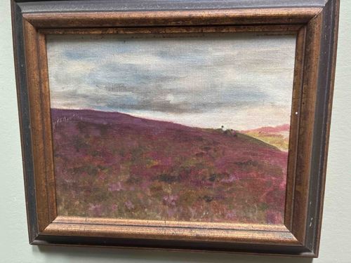 This item is an original oil painting on canvas board, depicting a rolling highland landscape dominated by a field of purple heather under a cloudy, overcast sky. The composition features a diagonal hillside sloping from the left mid-ground towards the lower right, rendered in varying shades of violet, magenta, and earthy brown. The sky is painted with horizontal, impressionistic brushstrokes using a palette of grey, white, and muted blues. The canvas texture is clearly visible through the paint layers, suggesting a thin application technique common in late 19th to early 20th-century plein air studies. It is housed in a carved wooden frame with a dark mahogany finish and an inner gilded cove edge. The gilding shows minor signs of aging with a slight dullness to the luster. Notable condition issues include minor frame abrasions on the lower right corner and a small white speck (possible paint loss or debris) on the right edge of the canvas. No signature is visible in the provided image, though one may be present under the frame's rabbet or on the reverse. The overall style suggests a British or Scottish school landscape from the circa 1920-1940 period.
