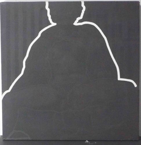 This is an original contemporary artwork on square canvas featuring a minimalist, high-contrast composition. The work utilizes a monochromatic palette, consisting of a solid matte charcoal-black background with a single, continuous white outline. The outline depicts a large, seated silhouette that appears to be a figure in meditation or a cross-legged pose, possibly a Buddha-like form. The linework is thick and gestural, showing varying widths that suggest a hand-painted application rather than a stencil. Notably, the white line breaks at the top edge and extends to both the left and right margins, creating a sense of scale larger than the frame itself. Within the black negative space of the figure, there are very faint, subtle charcoal-colored lines or under-drawings that suggest an anatomical interior, visible only upon close inspection. The canvas appears to be gallery-wrapped with painted edges. Condition-wise, the piece appears well-preserved with no major structural damage, though slight surface scuffing or dust accumulation is visible on the dark matte finish. The style is late 20th to early 21st-century contemporary minimalism. There are no visible signatures or maker's marks on the face of the painting.