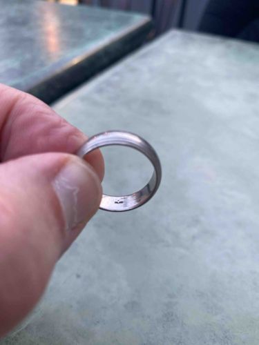 This item is a classic men's wedding band crafted from high-density platinum, as indicated by the user-provided context. The ring features a D-shape or 'low-dome' profile, characterized by a rounded convex exterior and a flat interior surface designed for a comfortable fit. The metal exhibits a characteristic high-luster, white-to-silvery metallic finish synonymous with platinum. Based on the scale provided by the fingers in the image, the band appears to have a width between 5mm and 6mm. A significant feature is the interior engraving or hallmark located on the lower inner shank; while the image resolution makes it difficult to read fully, it appears to include a 'PLAT' or 'PT950' purity mark alongside a possible maker's mark or logo. In terms of condition, the band shows visible signs of regular wear, including a fine network of surface scratches and 'patina' common to platinum, which develops a duller, matte appearance over time rather than wearing away. There are no signs of major structural deformity, deep gouges, or resizing seams visible in this view. The craftsmanship suggests a high-quality, solid-cast construction typical of modern luxury bridal jewelry. Its timeless, minimalist aesthetic makes it difficult to date precisely, but it likely falls within the contemporary era (late 20th century to present).