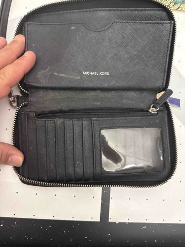 This is a Michael Kors Jet Set Travel zip-around continental wallet, crafted from the brand's signature black Saffiano leather, known for its durable cross-hatch texture. The interior configuration is highly functional, featuring seven vertical credit card slots, a clear ID window, a middle zippered coin compartment, and multiple slip pockets for bills or documents. The wallet is secured by a heavy-duty, silver-tone wraparound metal zipper. A silver-stamped 'MICHAEL KORS' logo is prominently displayed on the interior leather flap. In terms of condition, the item shows significant signs of previous use and wear. There are visible white scuffs, debris, and possible cosmetic staining across the leather surfaces and inside the card slots. The clear ID window appears clouded and scratched from contact with cards. The silver-tone hardware exhibits some surface dulling consistent with frequent handling. Despite the surface grime and wear, the stitching appears intact, and the structured Saffiano leather retains its original shape, though a deep cleaning would be required to restore its aesthetic appeal. This style is consistent with the brand's contemporary accessory line from the 2010s, emphasizing practicality and brand recognition.