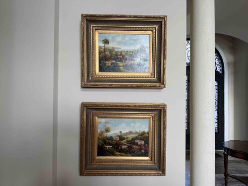 This set consists of two horizontally oriented oil paintings, likely on canvas or board, depicting lush tropical or Caribbean-inspired landscapes with hillside villages. The artworks feature a variety of small white-walled structures with red or dark roofs nestled among rolling green hills, palm trees, and dense foliage under a softly clouded sky. The brushwork appears painterly and traditional, suggesting a mid-to-late 20th-century creation influenced by 19th-century colonial landscape styles. Each piece is housed in a substantial, decorative composite frame with a tiered profile. The frames feature a dark, antiqued bronze or olive-toned finish on the outer cove and a brighter gilded gold-leaf finish on the inner beaded filigree and sight edge. The construction of the frames is ornate, with a recurring bead-and-reel pattern and textured patina that mimics aged wood. While the artworks appear well-preserved under interior lighting, the frames show some minor indications of light dust accumulation in the crevices, but no significant chipping or loss of gilding is immediately visible. The craftsmanship suggests production for high-end home decor or a regional gallery, characterized by a harmonious color palette of earthy greens, pale blues, and warm whites. These pieces are designed to be displayed as a matching diptych, providing a symmetrical and cohesive aesthetic to an interior wall.