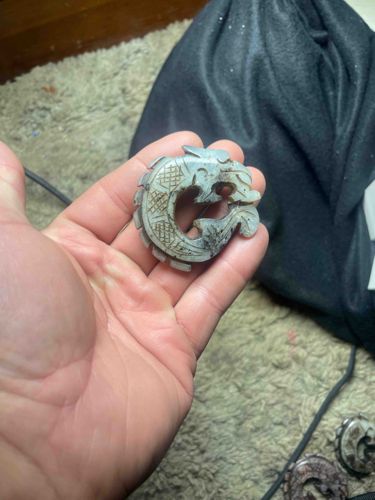 This item is a hand-carved pendant, likely made of jadeite, nephrite, or a similar green-gray hardstone, designed in the form of a 'C-shaped' dragon or 'zhülong' (pig dragon). It measures approximately 2 to 2.5 inches in diameter. The stone exhibits a mottled pale sage green and grey color palette with significant dark mineral inclusions and brownish calcification or 'chicken-bone' white weathering patterns, suggesting an intentional aged or archaic aesthetic. The carving features deep incised lines forming a cross-hatch or diamond-grid pattern along the body, representing scales, and fluted notches along the outer perimeter. The dragon's head is stylized with a large circular eye and a curved snout characteristic of Hongshan culture revival pieces. Regarding condition, there is visible surface wear, grime accumulation in the recessed carvings, and minor pitting on the edges. The overall craftsmanship shows traditional lapidary techniques with irregular hand-carved incisions rather than modern precision machining. While the style is Neolithic/Archaic, the surface patina suggests it may be a later 20th-century reproduction or 'archaistic' piece rather than a period artifact. No visible maker's marks or signatures are present, which is typical for this type of lapidary work.