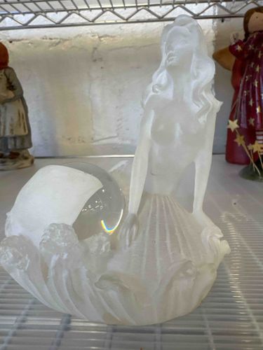 This piece is a decorative figurine depicting a stylized mermaid emergence. It is crafted from a frosted or 'satin' glass material, potentially cast resin or pressed glass, giving it a translucent, matte white appearance. The figure features a semi-nude mermaid with long flowing hair, seated atop a base designed to simulate churning ocean waves. A notable feature is the inclusion of a clear glass or lead crystal sphere (orb) nestled within the curve of the mermaid's tail and the waves, which exhibits a slight spectral or iridescent refraction of light. The construction suggests a late 20th-century decorative style, reminiscent of Art Deco revival aesthetics often seen in the 1980s or 1990s. The texture of the 'frosted' surface appears uniform, though some minor surface grime or shelf wear is visible in the recessed areas of the waves. There are no overt maker's marks visible in the photograph, but the level of detail in the casting indicates a mass-market giftware origin rather than a unique studio glass piece. The condition appears to be good with no visible chips, cracks, or significant abrasions to the matte finish or the clear sphere.