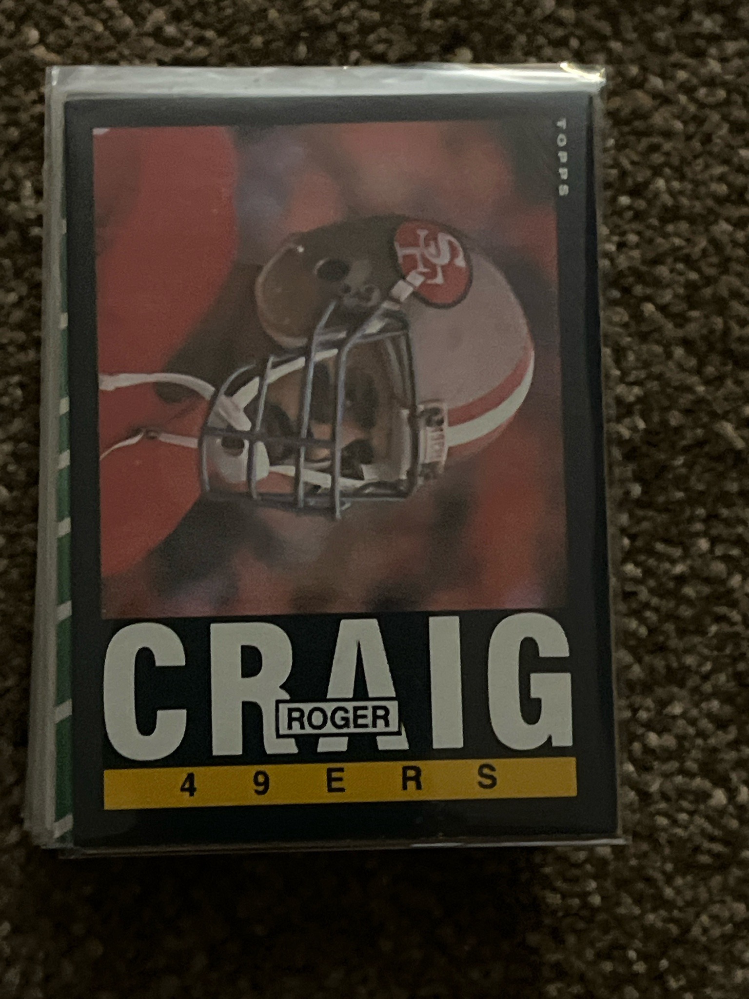 This is a 1991 Topps football trading card featuring star running back Roger Craig of the San Francisco 49ers. The card measures approximately 2.5 by 3.5 inches and is printed on standard cardstock. The design is characteristic of the early 1990s Topps aesthetic, featuring a dark black or navy blue border. The front of the card displays a dynamic close-up photograph of Craig in his red and gold 49ers helmet, showcasing the iconic 'SF' oval logo. The bottom of the card utilizes a bold, white sans-serif font for the surname 'CRAIG', with a small boxed 'ROGER' positioned within the 'A'. Below the name is a yellow stripe reading '4 9 E R S'. The 'TOPPS' logo is visible in the upper right corner. The card appears to be housed in a clear protective plastic sleeve and is part of a stack. The visible condition shows relatively sharp corners for an uncertified card, though the centering appears slightly shifted toward the top. There are no obvious creases or surface scratches visible through the sleeve, though minor edge wear may be present on the dark borders which are prone to showing chipping. This card represents a transition period in Craig's career, as 1991 was the year he moved to the Raiders, but he is depicted here in his legendary 49ers uniform.