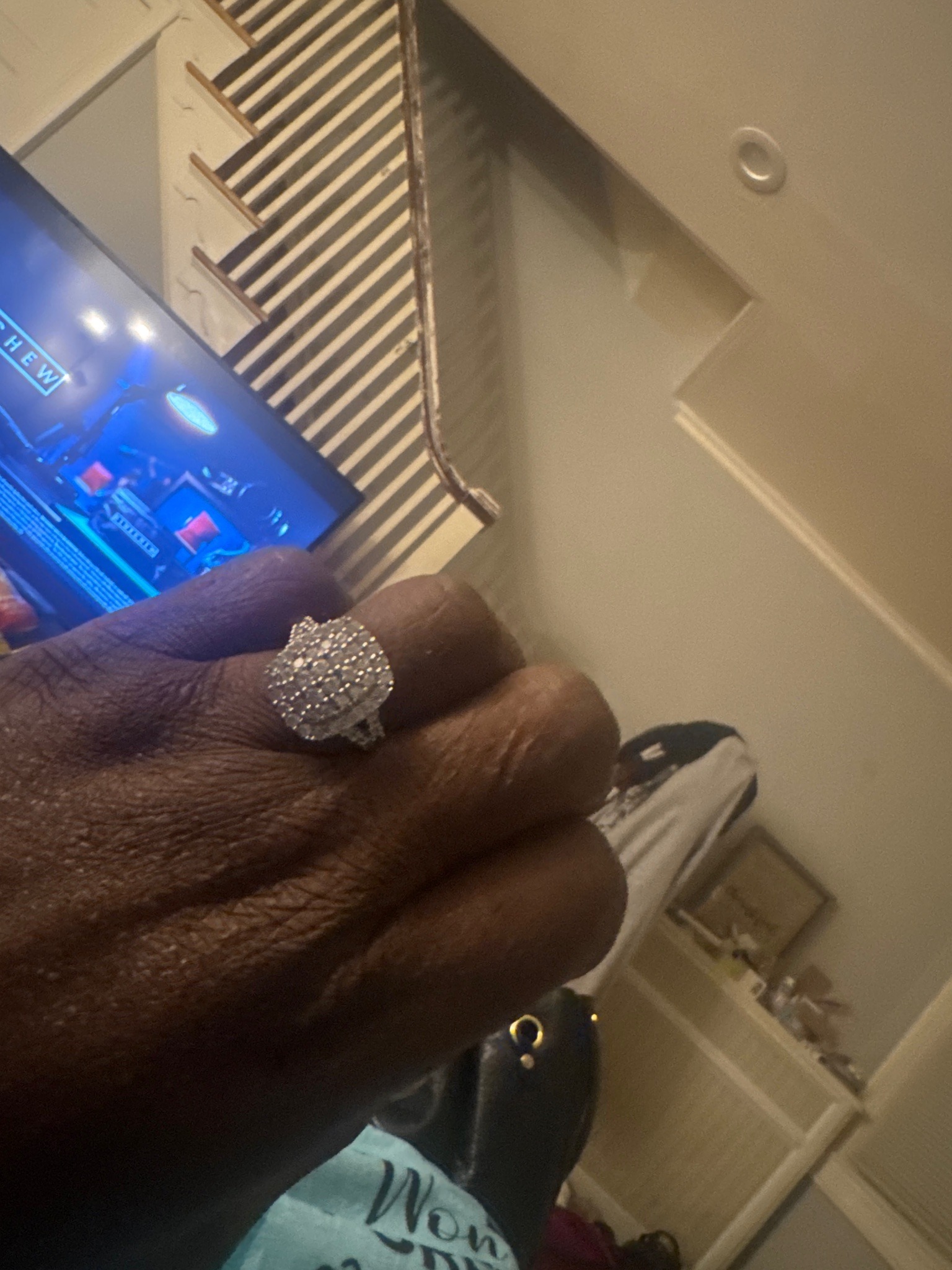 This contemporary style engagement ring features a prominent square or cushion-shaped head composed of a multi-diamond cluster. The central design utilizes a composite setting where several smaller round brilliant-cut diamonds are grouped together to create the visual impression of a larger single stone. This central cluster is encircled by at least one, possibly two, tiered diamond halos, which enhance the overall diameter and brilliance of the face. The diamonds are set in what appears to be a white metal precious metal, likely 10k or 14k white gold or sterling silver, though hallmarks are not visible in the provided image. The shank of the ring is also adorned with pavé or micro-prong set accent diamonds extending down the shoulders, contributing to a high-glitter aesthetic. The construction is typical of modern mass-market fine jewelry found in the late 20th to early 21st century. The condition appears fair to good with no immediately visible missing stones; however, the metal shows signs of general wear and light surface scratches consistent with regular use. The overall craftsmanship focuses on maximizing surface area and light return through multiple small facets rather than single large-stone clarity. Total carat weight cannot be determined without a physical inspection or appraisal document, but the visual profile is significant. The setting sits relatively high off the finger, a characteristic of 'princess' style or elevated halo mounts.