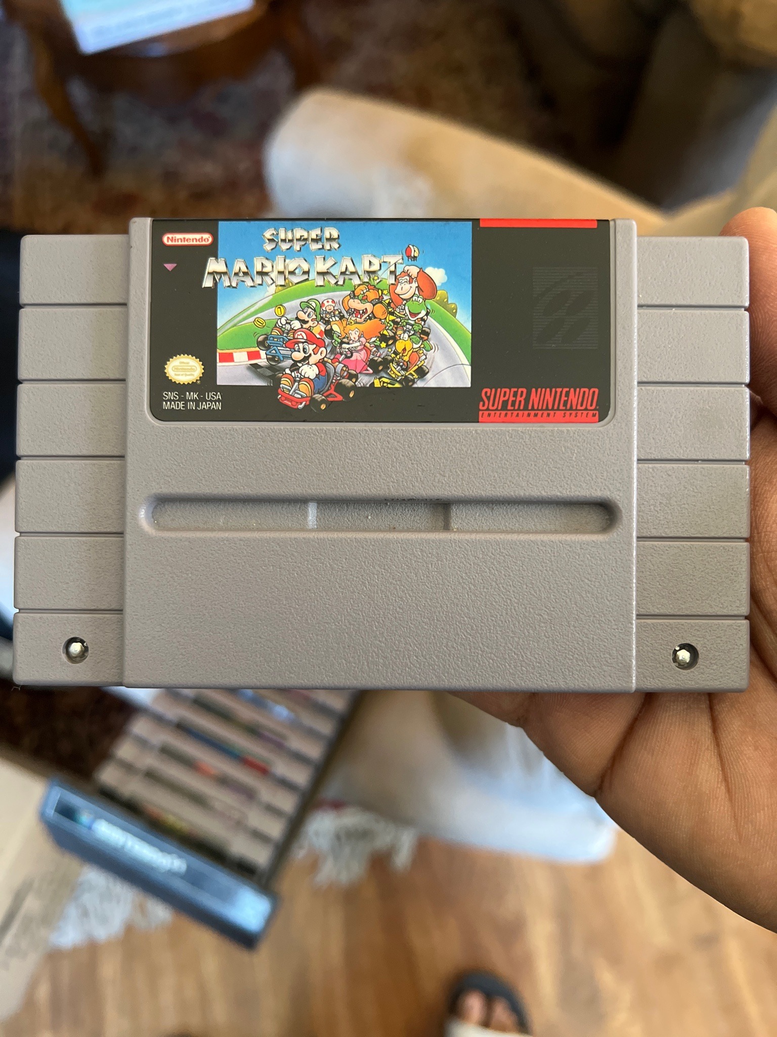 This is an original North American NTSC format game cartridge for the Super Nintendo Entertainment System (SNES), released in 1992. The cartridge is constructed of textured, light gray industrial plastic and features the iconic 'shallow groove' design characteristic of later-production SNES hardware. The front of the cartridge displays a vibrant color-printed label featuring various Super Mario characters in karts. Notable markings include the Nintendo Seal of Quality, the product code 'SNS-MK-USA', and the 'Made in Japan' designation. The design utilizes two security-style Gamebit screws on the lower front face to prevent tampering with the internal PCB. In terms of condition, the cartridge appears in excellent vintage state; the label shows sharp colors with minimal peeling at the edges and no significant scratching or fading. The plastic housing exhibits a uniform color, suggesting it has not suffered from the typical fire-retardant-induced yellowing (oxidation) common in SNES hardware. There are minor traces of dust in the lower horizontal groove, but the overall exterior is clean and well-preserved. This is one of the most significant titles in video game history, marking the debut of the Mario Kart franchise, and its physical condition indicates high collectibility for a loose cartridge.