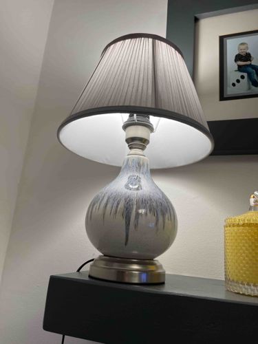 This is a contemporary table lamp featuring a bulbous, onion-shaped ceramic body mounted on a circular brushed metal base. The ceramic vessel displays a striking reactive drip glaze technique, where a dark slate grey or blue pigment cascades down a light grey or cream-colored ground, creating a vertical, organic feathered pattern that is unique to each piece. The neck of the lamp transitions into a white socket assembly containing a standard bulb. It is topped with a tapered, pleated fabric lampshade in a neutral grey tone, which features a darker piping along the upper and lower rims. The pleats are fine and uniform, suggesting a modern manufacturing process. Physically, the lamp stands approximately 14 to 18 inches tall. The brushed nickel or stainless steel finish on the base provides a sleek, industrial contrast to the artisanal ceramic texture. The overall condition appears excellent with no visible cracks, chips, or crazing in the ceramic glaze. The shade is taut and free of staining or scorching. The construction reflects mid-to-high-end mass-produced home decor, likely dating from the 2010s to the present, influenced by mid-century modern pottery aesthetics.