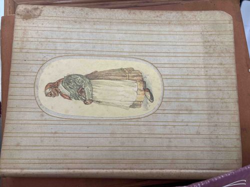 This item is a rectangular, landscape-oriented hardcover object, likely a vintage book, journal, or stationery folder. The exterior features a textured ivory or cream-colored paper or cloth covering, decorated with a horizontal pinstripe pattern in a light tan or gold tone. Centered on the front cover is a pill-shaped cartouche containing a detailed color illustration of a woman in traditional European peasant or folk attire, possibly of Italian or Mediterranean origin. She is depicted wearing a green shawl, a long white apron, and a layered skirt. The physical condition shows significant signs of age, including prominent foxing (brown spotting) across the surface, edge wear, and corner bumping. There is a visible reddish-brown stain in the upper left corner. The craftsmanship suggests a mid-20th-century production, approximately 1940s-1960s, utilizing a lithographic printing process for the central image. The spine appears rounded, indicating a bound structure. No specific maker's marks are visible on the exterior, but the style is reminiscent of souvenir albums or decorative personal journals from that era.