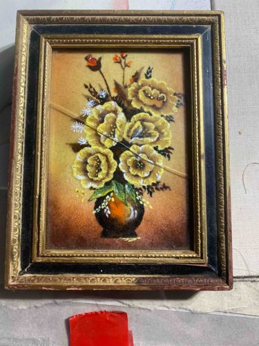 This item consists of a vintage miniature still-life oil painting executed on a textured brown velvet or suede-like fabric substrate. The artwork depicts a bouquet of yellow and cream-toned flowers reminiscent of poppies or peonies, gathered in a dark, bulbous ceramic-style vase against a warm, gradient background. The painting uses a thick impasto-like application for the highlights on the petals, creating a three-dimensional effect. Notable features include a prominent diagonal crack or deep scratch running across the center of the image area, likely indicating damage to the underlying support or a severe tear in the fabric. The piece is housed in a decorative multi-tiered wooden frame featuring a gilded inner bead, a black recessed cove, and an outer gilded border with embossed scrollwork and floral motifs. There is significant condition wear visible on the frame, including several areas of loss to the gilding particularly along the bottom edge where the underlying reddish clay-like bole or wood is exposed. The craftsmanship suggests a mid-20th-century mass-produced decorative work intended for domestic interior decor, likely dating between the 1960s and 1970s when velvet paintings were highly popular.