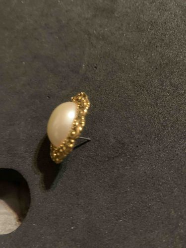 This item is a single vintage-style stud earring featuring a prominent oval faux pearl cabochon. The central element is a high-domed, cream-colored simulated pearl with a soft luster and satin finish. It is securely bezel-set within a decorative yellow gold-toned metal frame. The frame displays a textured, 'nugget' or granulated border often characteristic of mid-to-late 20th-century costume jewelry craftsmanship. In terms of dimensions, the piece appears to be approximately 15mm to 20mm in length, categorized as an oversize stud. The back of the piece reveals a straight metal post for pierced ears, which shows slight darkening or oxidation, suggesting it may be a base metal or gold-plated alloy rather than solid high-karat gold. The overall condition shows moderate signs of age; there is visible wear to the gold-tone plating along the textured edges, revealing a darker base metal beneath. Minimal surface scratches are present on the dome of the cabochon. This style is emblematic of the bold, classic costume jewelry popular from the late 1970s through the 1980s, designed to mimic high-end fine jewelry designs from houses like Chanel or Dior. No maker's marks are visible from this angle, though the casting quality suggests a mass-market fashion accessory production.