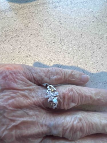 This is a contemporary fashion ring crafted from a white-toned metal, likely sterling silver or white gold. The ring features a symbolic multi-element head design, centered around a small horizontal cross motif that is surface-set with several minute, round-cut clear stones, possibly cubic zirconia or small diamond melee. Flanking the central cross are two distinct, round-cut bezel-set gemstones: one appears to be a light amber or champagne-colored stone situated above the cross, while the other is an iridescent white stone, likely an opal or mother-of-pearl, situated below. The band incorporates decorative open-work or filigree swirls that transition into a standard polished shank. The overall construction suggests a modern mass-produced piece rather than a bespoke antique. While the photo resolution limits a definitive view of hallmarks, the brightness of the metal and the setting style point toward 20th or 21st-century production. Condition-wise, the ring shows normal signs of wear consistent with a frequently worn piece, with minor surface abrasions visible on the metal through the light reflection. The stones appear secure in their settings, and the overall structural integrity of the bypass-style head remains intact.