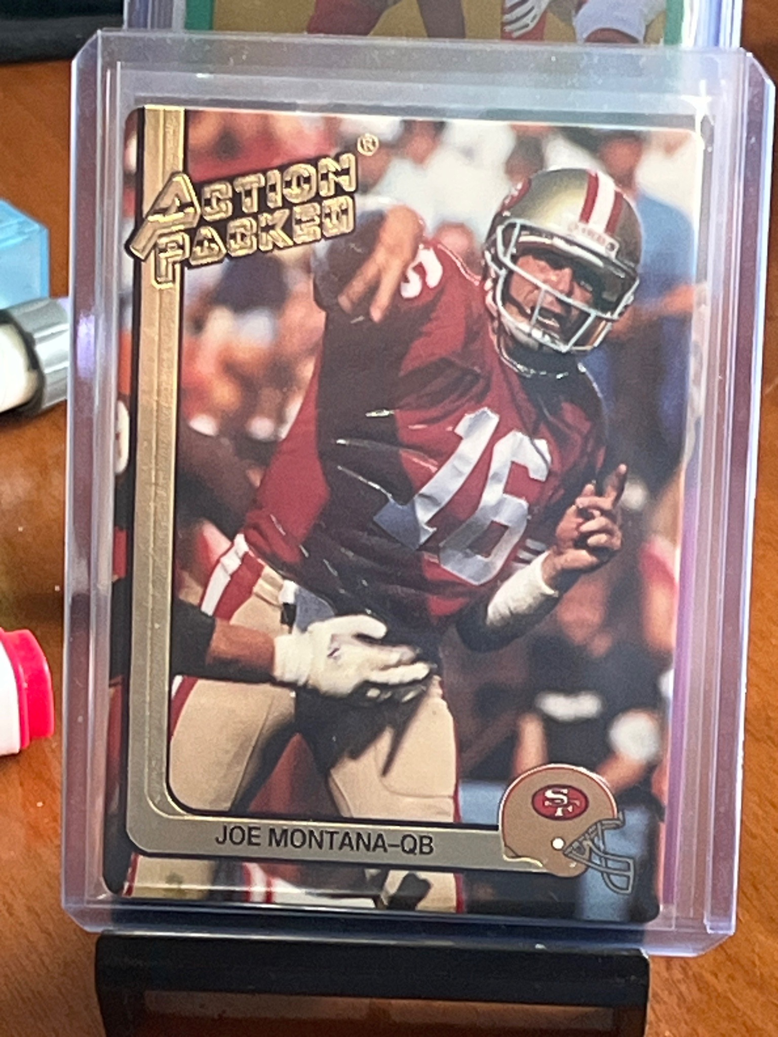 This is a 1991 Action Packed football card featuring Hall of Fame quarterback Joe Montana of the San Francisco 49ers. The card is distinguished by Action Packed's signature high-relief embossed technology, which creates a three-dimensional texture on the player's figure. The front shows Montana in his iconic red and gold home jersey, mid-throw. The card features rounded corners, a trademark of the brand during this era, and a gold-foil stamped 'Action Packed' logo in the upper left. A small San Francisco 49ers helmet logo is positioned in the bottom right corner alongside his name and position. The construction consists of a thick cardstock with a glossy finish. This specific example appears to be in Excellent-Mint condition, housed in a Protective 'top loader' plastic sleeve. There is minor visible edge wear on the gold border, and centering appears slightly heavy towards the bottom. The colors remain vibrant with no signs of fading or moisture damage. This card represents the early 1990s 'premium card' boom, where manufacturers experimented with physical textures and high-end printing techniques to appeal to serious collectors.