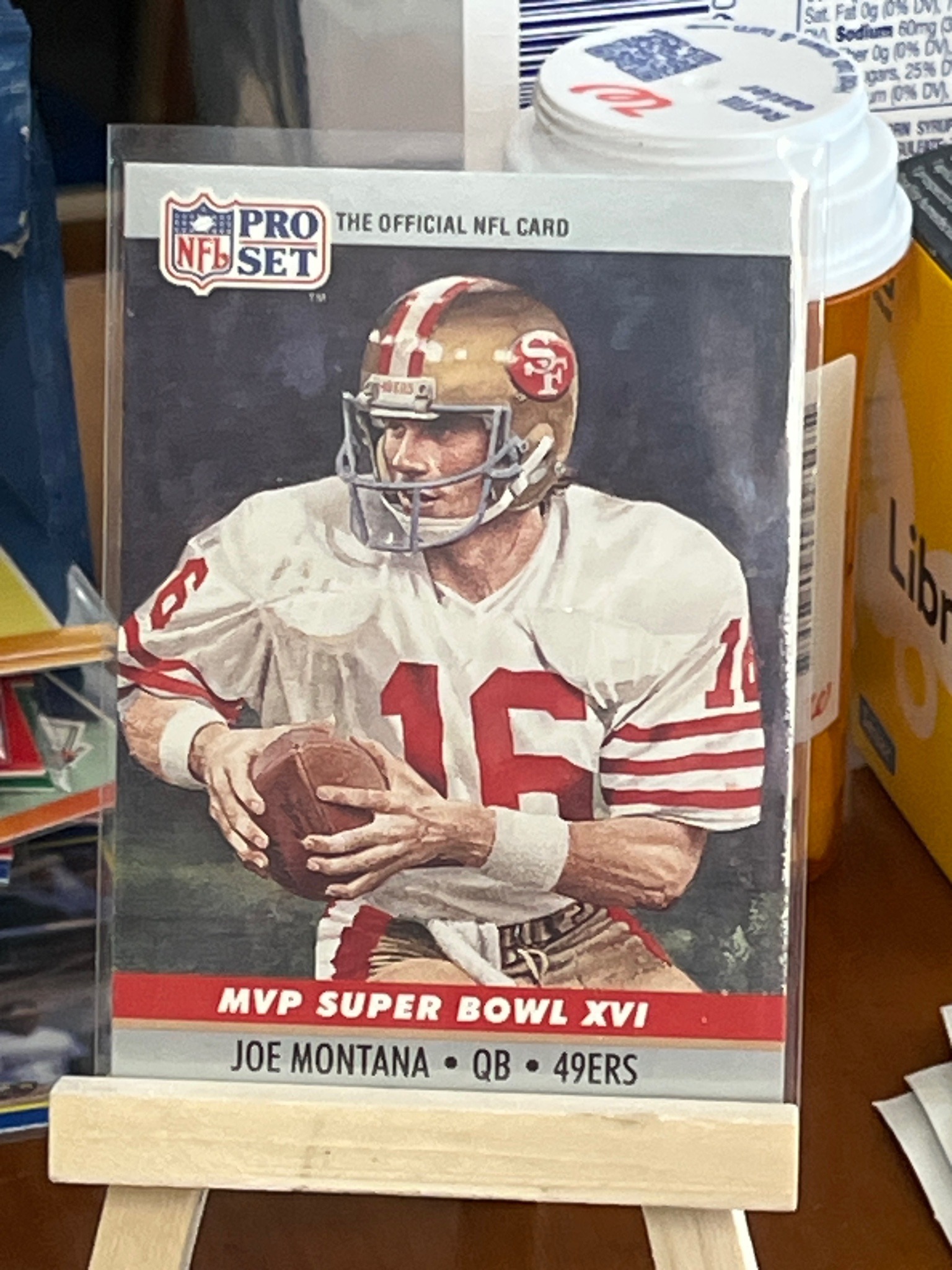 This is a standard 2.5 by 3.5-inch trading card from the 1990 Pro Set football series, featuring San Francisco 49ers legendary quarterback Joe Montana. The card commemorates his performance as the MVP of Super Bowl XVI. The front of the card utilizes a painterly, artistic illustration rather than a standard photograph, depicting Montana in his white away jersey with red numbers and stripes, holding a football. The Pro Set logo and 'THE OFFICIAL NFL CARD' text are located at the top left. The bottom features a red banner with white text reading 'MVP SUPER BOWL XVI' and a grey footer displaying the player's name, position, and team. The card is printed on semi-glossy cardstock. Regarding condition, the card is housed in a clear protective plastic sleeve. Observable wear includes slight white chipping and softening along the right edge of the card, particularly near the center. The top right corner appears to have a very minor ding. The centering seems slightly weighted toward the left margin. The colors remain vibrant without significant fading. This card was mass-produced during the 'Junk Wax Era' of sports cards, making it very common, though it remains a iconic piece of memorabilia for 49ers fans and Montana collectors.