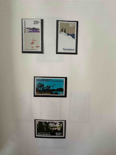 This collection consists of four distinct New Zealand postage stamps displayed on a gridded album page. The set includes a vertical 25c stamp featuring Fiordland National Park with a stylized landscape and boat motifs in purple, grey, and brown tones. Adjacent is a vertical 30c stamp for Mt. Cook National Park, depicting mountain climbers on a snowy peak against a tan sky. Below these are two horizontal stamps: a 5c issue commemorating the 50th Anniversary of the Royal Forest and Bird Protection Society (1923-1973) shown in vibrant blues and greens, and a 50c stamp featuring Westland National Park with a dense forest and water scene. Each stamp is printed using high-quality photogravure or offset lithography, characteristic of the 1970s and 80s era of New Zealand Post issues. The colors remain saturated and bright, indicating minimal light exposure. The stamps are mounted on black backgrounds (likely Hawid-style mounts) which protect the original gum. No visible cancellations or heavy hinges are present from the front, suggesting they are in Mint Never Hinged (MNH) or Mint Lightly Hinged (MLH) condition. The perforations appear intact across all four edges for each specimen, with no visible toning, foxing, or creasing, which is essential for philatelic value. The graphic design reflects the modernist aesthetic typical of late 20th-century New Zealand commemoratives, emphasizing natural heritage and conservation.