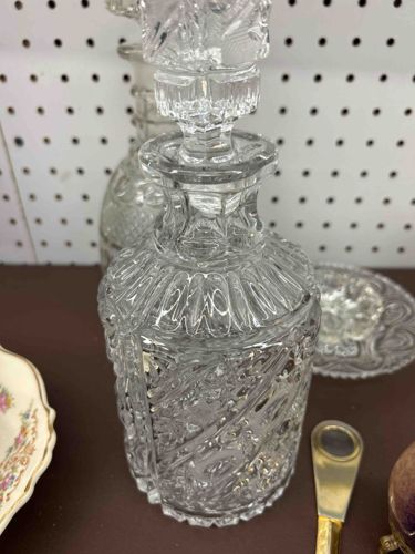 This item is a clear glass spirits decanter featuring a highly decorative pressed pattern. The piece is cylindrical in the body, transitioning into a sloped shoulder decorated with vertical thumbprint or flute motifs. The main body is characterized by a complex geometric pattern featuring diagonal bands, faceted starbursts, and diamond point textures common in mid-20th-century glassware. The neck is tapered with a flared rim, holding a square-topped multifaceted glass stopper that mimics the cutting style of the base. The material appears to be clear soda-lime glass rather than lead crystal, as evidenced by the lack of sharp edges on the pattern lines, which is indicative of a press-molded process. No visible maker's marks or signatures are apparent in the image, suggesting it may be a mass-produced piece from the 1950s-1970s. The condition appears fair to good; while the glass maintains its clarity, there is visible residue or 'clouding' on the interior lower half, common with aged decanters. The stopper shows some slight misalignment in the neck, and minor flea bites or chips may be present along the sharpest points of the pressed pattern. The base shows a serrated 'tooth' edge commonly found in EAPG (Early American Pattern Glass) revival styles.