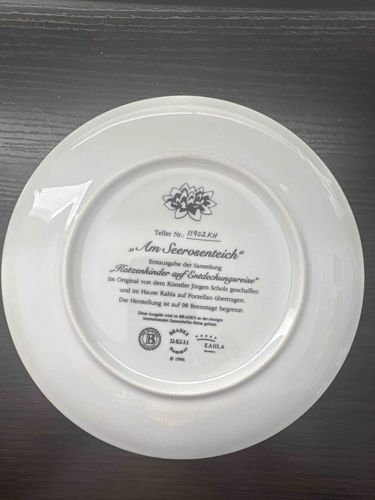 This is a fine porcelain collector plate featuring the backstamp information for the piece titled 'Am Seerosenteich' (At the Water Lily Pond). The plate is the first issue (Erstausgabe) in the collection 'Katzenkinder auf Entdeckungsreise' (Kittens on a Voyage of Discovery), based on original artwork by the artist Jürgen Scholz. It was manufactured by Kahla Porcelain in Germany in 1996, as indicated by the 'Kahla Germany' logo and the copyright date. The plate is constructed from bright white vitrified porcelain with a smooth, glossy glaze finish. The backstamp includes the Bradex number 22-K2-2.1 and a unique plate number (Teller Nr. 11902 KH). The text specifies that the production was limited to 98 firing days. Physically, the plate is circular with a shallow foot rim typical of display plates. The condition appears excellent with no visible chips, cracks, or crazing, and the black transfer-printed text on the reverse remains crisp and legible. The craftsmanship reflects the high standards of Kahla's commercial porcelain production for the collectibles market in the late 20th century.