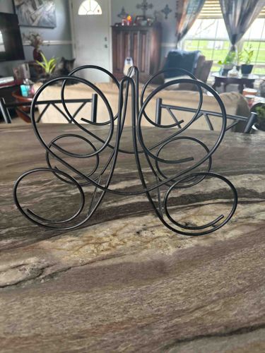 This item is a decorative holder crafted from curved metal wire, uniquely shaped to resemble a butterfly with its wings spread out. The piece is finished in a uniform matte black coat, likely a powder-coated or painted finish over a steel or iron frame. It features a symmetrical design with six distinct circular loops—three on each side—designed to cradle cylindrical objects or act as dividers for paper. The central vertical structure serves as the body of the butterfly and provides structural stability. In terms of construction, the wire is joined at several contact points using spot welds, which appear functional but basic in quality. The item's condition appears used but well-maintained, with no visible signs of significant rust or structural deformation, though slight surface scratching or dust may be present. This mass-produced contemporary home accessory likely dates from the late 20th to early 21st century and fits a rustic or modern farmhouse aesthetic. It lacks any visible maker's marks or stamps, suggesting it was produced for a general retail market rather than as a bespoke artisan piece. Its lightweight construction indicates it is intended for tabletop use for lightweight items like wine bottles, hand towels, or mail.