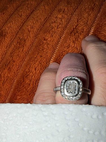This is a contemporary-style engagement ring crafted in white gold, featuring a central cushion-cut gemstone, likely a diamond. The center stone is securely held within a bezel or semi-bezel setting, surrounded by a rounded rectangular or 'cushion' halo of smaller, round brilliant-cut accent stones. The metal construction exhibits the bright, silvery-white luster characteristic of rhodium-plated white gold. The shank or band of the ring is further embellished with a pave or micro-pave setting of diamonds extending down the shoulders, adding significant brilliance to the profile. Based on the design, this piece likely dates to the early 21st century (circa 2010s to present), reflecting the popular modern-vintage aesthetic. In terms of condition, the ring shows some visible signs of wear consistent with regular use; there appears to be some minor 'cloudiness' or buildup on the stones which could be addressed with professional cleaning, and the white gold may eventually require re-rhodium plating to maintain its crisp finish. No hallmarking is visible in the photograph, but the craftsmanship suggests a high-quality commercial jewelry production with clean lines and symmetrical stone placement.