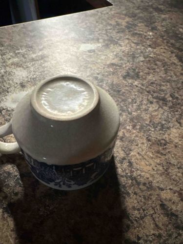 This item is a standard-sized ceramic handle mug, specifically a piece of stoneware featuring the classic 'Blue Willow' transferware pattern. The mug is shown inverted on a textured laminate surface. The body of the mug is constructed from a heavy-set ceramic material, likely stoneware, characterized by a creamy off-white or light gray glaze. The lower section of the exterior is decorated with a detailed blue underglaze transfer print, depicting elements of the traditional Willow story, including an oriental pagoda, floral motifs, and geometric borders. The base of the mug features a raised unglazed foot ring, protecting the glazed center where an impressed mark is visible. The mark appears to include the word 'CHINA' in an arched capital font, indicating its country of origin. This specific style of embossing and the thickness of the glaze suggest a mid-to-late 20th-century mass-production timeline, approximately 1970s-1990s. The condition appears to be fair to good for a utilitarian item; there is noticeable surface grime and moderate utensil marking or light staining around the foot ring and bottom surface. There are no large chips or structural cracks visible from this angle, though the glaze shows a slightly pebbled texture characteristic of budget-friendly kiln firing processes of that era.