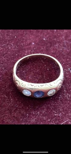 This item is a 19th-century inspired yellow gold ring, frequently referred to as a 'Gypsy set' or flush-mount band. The piece is constructed from a substantial yellow gold band, likely 14k or 18k, which widens significantly at the crown to accommodate the recessed gemstones. The focal point features three round-cut gemstones aligned horizontally: a central blue sapphire flanked by two colorless diamonds. The metal surface is embellished with intricate hand-engraved scrollwork and foliate motifs that wrap around the shoulders of the band, a hallmark of late Victorian and Edwardian craftsmanship. The sapphire exhibits a deep, saturated navy blue hue, while the diamonds appear clear with moderate brilliance. In terms of condition, there is visible surface wear consistent with age, including fine scratches on the gold and a softening of the engraved details. The band maintains its circular structural integrity with no obvious resizing marks visible from the primary angle. The flush-setting technique used here provides a smooth profile, protective of the stones, which suggests a design intended for frequent daily wear. There are no visible maker's marks or hallmarks discernible in this view, though they would typically be located on the inner shank. The overall quality reflects skilled hand-finishing common in the late 1800s to early 1900s.