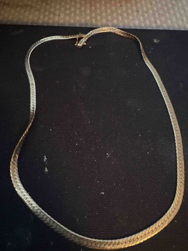This is a fine jewelry necklace featuring a classic herringbone weave, characterized by flat, slanted parallel links that create a fluid, ribbon-like texture. Measuring approximately 18 inches in length and 3.0mm in width, the piece is constructed from 14-karat yellow gold. The chain exhibits a reflective, high-polish finish typical of Italian goldsmithing. According to the provided context, the item includes a '14kt Italy' stamp on the clasp mechanism, confirming its gold purity and geographic origin. The necklace is secured with a traditional lobster claw or box-style clasp with a safety catch. Given its 40-year age, the piece dates back to the early 1980s, a period when the herringbone style was highly fashionable. The construction is delicate; visible kinking or slight warping in the weave is a common condition issue for this style, though this example appears to retain a good degree of its original supple drape. There is a light patina consistent with four decades of ownership, with no significant structural repairs or heavy deep scratches observable in the documentation. The 'Italy' hallmark is a strong quality indicator, as Italian manufacturers from the late 20th century were world-renowned for their mastery of fluid, flat gold chains.