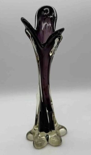 This is an elegant Mid-Century Modern sculptural art glass vase, designed in the iconic 'Jack-in-the-Pulpit' or 'Calla Lily' floral form. The vessel stands as a tall, slender bud vase featuring a deep purple or amethyst core encased within a thick layer of clear glass, utilizing the sophisticated Italian 'Sommerso' (submerged) technique. The construction begins with a wide, bulbous trefoil or four-lobed base that provides stability, transitioning into a narrow, elongated fluted body. The rim is artistically pulled and shaped into three distinct petals, with one tall rear petal and two smaller side petals, mimicking a blooming flower. The glass exhibits a high degree of clarity and brilliance, typical of leaded crystal or high-quality soda-lime glass. While no specific maker's marks or signatures are visible in the image, the style and craftsmanship are highly reminiscent of 1950s-1970s Murano glass (Italy) or similar work by Chalet (Canada) and Viking (USA). The condition appears excellent with no visible chips, cracks, or heavy scratching; the base shows natural polishing indicative of hand-finished production. The internal purple color provides a dramatic contrast against the thick clear casing, showcasing the fluid, organic lines characteristic of the period's biomorphic design trends.