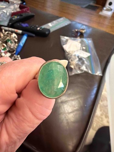 This item is a large-format cocktail ring featuring a prominent oval-cut green gemstone, likely emerald, green onyx, or dyed quartz, secured in a simple bezel setting. The gemstone displays a vibrant mint-to-seafoam green color with visible internal inclusions and a semi-translucent opacity typical of mid-grade natural emeralds or treated stones. It is cut with a rose-cut or checkerboard-style faceted top that catches the light across its surface. The setting is constructed from a polished white metal, most likely sterling silver, given the style and simple bezel construction which wraps entirely around the girdle of the stone. The ring appears to be of contemporary or late 20th-century manufacture, following a 'bohemian modern' aesthetic. No maker's marks or metal fineness stamps (like '925') are clearly visible from the primary angle, though they would typically be located on the interior of the shank. The condition appears fair to good, with some minor surface abrasions on the gemstone facets and a slight patina or dulling on the metal setting, consistent with moderate wear. The large size of the focal stone makes it a significant decorative piece, though the visible internal fractures suggest it is not of high jewelry grade.