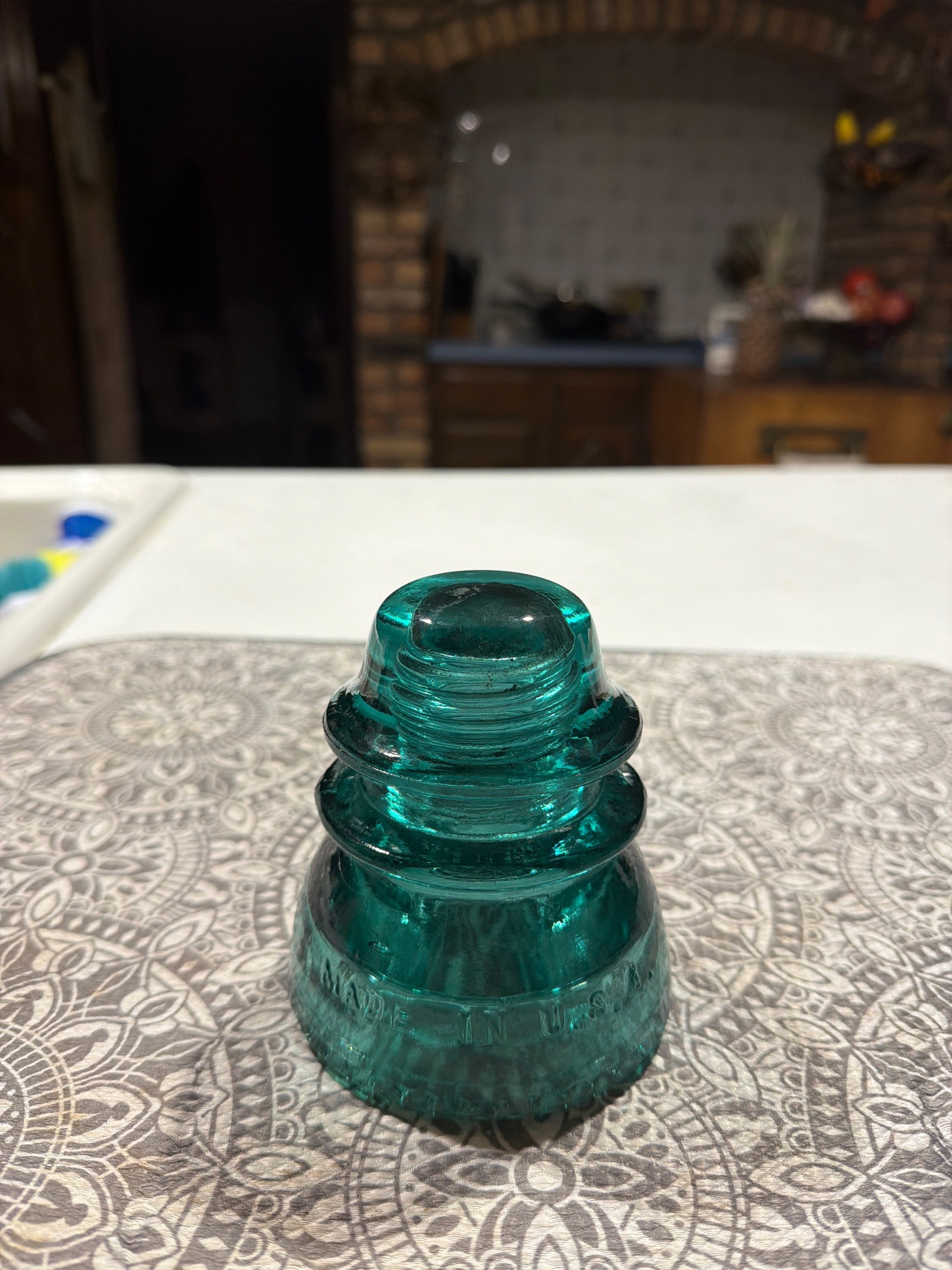 This is a vintage aqua green molded glass electrical insulator, likely manufactured by the Hemingray Glass Company. The item features a classic 'pony' or 'beehive' profile with multiple tiered petticoats designed to shed water and prevent electrical leakage. It is constructed from thick, heavy soda-lime glass, characterized by its translucent teal-blue hue. Visible around the bottom circular base is the embossed text 'MADE IN U.S.A.', a common identifier for mid-20th-century utility glass. The top of the insulator has a rounded dome and a deep wire groove designed for securing telegraph or telephone lines. In terms of condition, there is a visible impact bruise or flake on the top dome, as well as minor surface scuffing throughout. The internal threading appears intact. Small air bubbles, or 'seed' bubbles, are visible within the glass, which are typical manufacturing artifacts of the era, likely dating from the 1920s to the 1950s. The base displays 'drip points' or nibs (not fully visible from this top-down angle but typical of the Hemingray process) which were designed to help moisture drop away more efficiently. The glass shows some 'orange peel' texture and light soot or dirt accumulation typical for a found utility object.