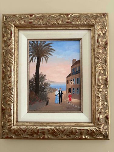 This is an original oil on canvas (or panel) painting by French Naïve artist Fabienne Delacroix. The piece depicts a Belle Époque-style coastal scene, featuring a man and woman in formal period attire walking a small black dog, accompanied by a child in red near a European-style building. To the left, a large, prominent palm tree dominates the foreground against a pastel sunset or sunrise sky reflecting over the ocean. The painting is executed in the classic 'Petit Naïf' style characteristic of the Delacroix family, favoring charming, simplified forms and a nostalgic atmosphere. The work is signed 'Fabienne Delacroix' in the lower right corner. It is housed in an elaborately carved, wide gilt wood frame with a cream-colored linen liner. The frame shows some minor wear and small red bolus peeking through the gilding in the upper left corner, which may be intentional distressing or age-related patina. The paint surface appears well-preserved with stable pigments and no visible cracking or loss. The composition and color palette are indicative of contemporary French Naïve art, likely produced within the last 20-30 years.