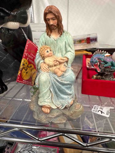 This is a contemporary religious figurine depicting Jesus Christ seated and cradling a young child. The piece is constructed of cast resin, a common material for mass-produced decorative statuary, allowing for fine organic textures in the hair and clothing. Jesus is depicted with traditional long brown hair and a beard, wearing a pale blue or seafoam green tunic with textured, draped folds that suggest a heavy fabric. The child features a stylized, almost doll-like appearance with large expressive eyes and curly blonde/golden hair. The figures are positioned on a base designed to resemble natural gray stone or rock. The color palette is composed of muted pastels with darker washes used to accentuate the recessed areas of the sculpt, providing a faux-antique or weathered finish. Regarding condition, there appears to be some minor paint loss or surface scuffing on the protruding edges of the 'stone' base and the toes of the figure. No visible maker's marks or signatures are apparent from the frontal view, suggesting this is a commercial giftware item from the late 20th or early 21st century. The level of detail in the casting is moderate, typical of mid-range devotional decor.