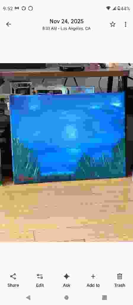 This is an original oil painting on a 18x24 inch gallery-wrapped canvas by American artist Robert Kurugian. The artwork features a nocturnal landscape, characterized by a dominant palette of deep blues, teals, and cooler cyan tones, representing a moonlit sky or water scene. The composition is anchored by dark, vertical silhouettes on both the left and right foreground, suggesting trees or tall reeds. Centrally, a soft, diffused light source, presumably the moon, creates a luminous glow that reflects toward the bottom edge of the canvas. The brushwork appears expressive with visible texture typical of oil medium, employing a horizontal-stroke technique in the central 'water' or 'sky' area to enhance the sense of vastness. The gallery-wrapped format indicates that the painting extends around the edges of the wooden stretcher bars, allowing it to be displayed without a frame. While the image shows typical edge handling common with modern canvas, the surface appears to be in good contemporary condition with no visible cracks or flaking. The artist's signature is traditionally located in the lower corner (obscured but noted as Kurugian). This piece represents a contemporary approach to impressionistic landscape painting, focusing on atmospheric light and mood.