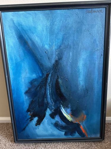 This is an original abstract mixed-media painting on canvas, signed 'Seabourn' in the upper right corner, attributed to the renowned American artist Bert Seabourn (b. 1931). The piece features a predominantly monochromatic blue palette, ranging from deep indigos to bright cerulean, with vertical gestural strokes that create a sense of movement and depth. At the lower center, a heavy impasto technique is utilized with black, dark blue, and small accents of orange and white, creating a gritty, textured focal point reminiscent of organic or avian forms. The canvas appears to be mid-to-large scale, housed in a thin, black modern wood frame that shows minor surface scuffing but remains structurally sound. The painting reflects a mid-late 20th-century Abstract Expressionist or Mid-Century Modern style, shifting away from the artist's more common figural Native American themes toward pure abstraction. The surface shows a mix of matte and slightly glossy finishes dependent on paint thickness, with no visible signs of cracking, flaking, or UV damage. The craftsmanship is high-quality, demonstrating a confident use of palette knives and brushwork to build atmospheric tension.
