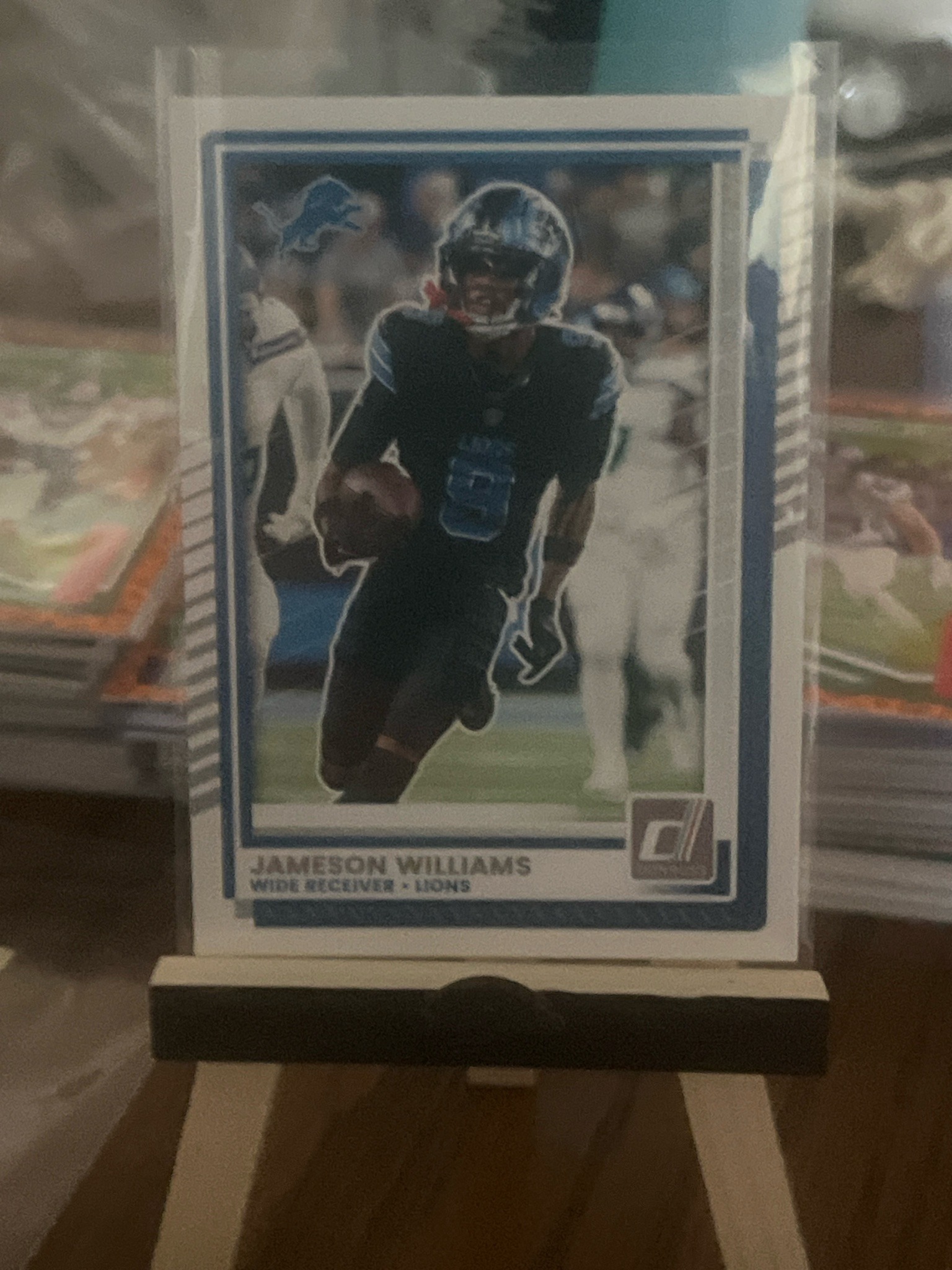 This is a 2023 Panini Donruss football trading card featuring wide receiver Jameson Williams of the Detroit Lions. The card is a standard 2.5 by 3.5-inch rectangular sports card printed on high-quality cardstock. The design features a centered action shot of the player in his black Detroit Lions alternate uniform, carrying a football. The card's aesthetic is defined by the classic Donruss white border, with a blue internal frame and silver-foil ‘D’ logo in the bottom right corner. The player’s name and position are clearly printed in a modern sans-serif typeface on the bottom left. In the top left, the Detroit Lions team logo is visible. The card is displayed within a clear protective plastic sleeve (penny sleeve) and is resting on a small wooden tabletop display easel. The condition appears to be near-mint based on a cursory visual inspection, with sharp corners and clean edges, though absolute grade would require professional examination under magnification to check for surface scratches or centering issues. No visible creases or staining are present. The background shows additional stacked cards, suggesting this is part of a larger hobbyist collection.