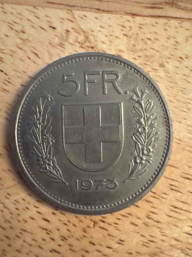 This is a circular Swiss 5 Franc coin, struck in copper-nickel as indicated by its distinct greyish-silver metallic luster and the 1973 date (transitioning from silver in 1968). The reverse side features the central Swiss coat of arms depicting a bold, equilateral cross within a shield. Flanking the shield is a wreath composed of edelweiss on the left and gentian flowers on the right, symbolizing alpine flora. The denomination '5 FR.' is prominently embossed at the top, while the year '1973' is located at the bottom. The coin features a beaded border along the inner rim. Measuring approximately 31.45 mm in diameter and weighing circa 13.2 grams, the piece shows moderate signs of circulation, including light surface scratches, micro-nicks, and a localized dark spot or patina near the 4 o'clock position. The relief remains crisp, suggesting a grade of Extremely Fine (XF). The craftsmanship is characteristic of the Swiss Federal Mint (Bern), known for high technical precision and enduring design.