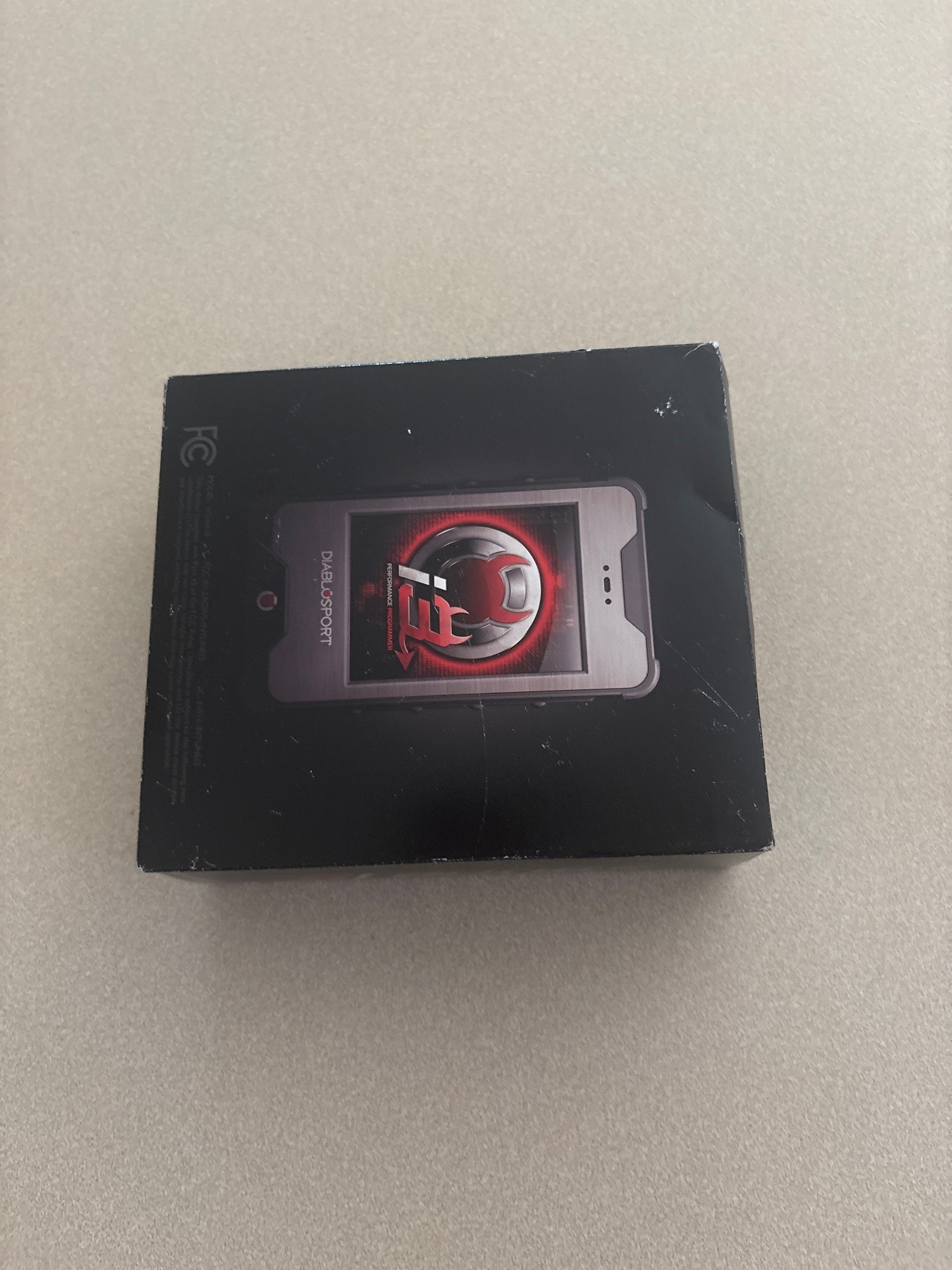 This item is a DiabloSport inTune i3 Performance Programmer, a handheld electronic tuning device designed for automotive engine management. The product is contained within its original black retail packaging box. The box features high-contrast graphic elements, including the red and silver 'i3' logo and a depiction of the device's brushed metallic facade. The packaging is constructed of semi-gloss cardstock and includes regulatory markings such as the FCC logo. Physically, the device pictured on the box is a compact, rectangular handheld unit with a large central display screen, designed for high-resolution graphics and user interaction through a touch interface or physical buttons. It is manufactured by DiabloSport, a well-known brand in the aftermarket performance sector. The condition of the exterior packaging shows visible shelf wear, including minor scuffing on the flat surfaces and white stress marks or peeling along the corners and edges, indicating it has been handled or stored. Detailed manufacturing information, likely including model number and vehicle compatibility, would typically be found on the rear or side of this box. This unit represents modern tuning technology meant for late-model domestic vehicles to optimize horsepower, torque, and fuel efficiency.