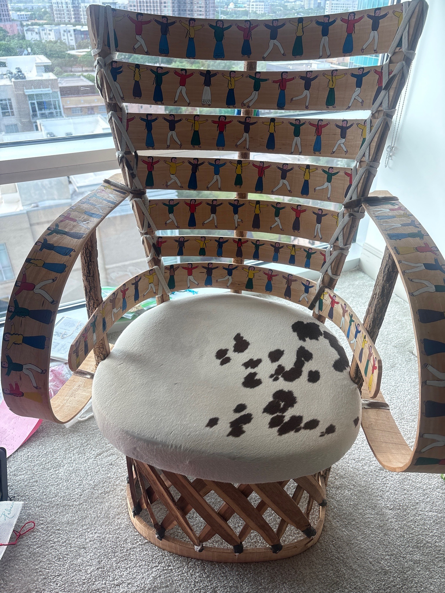 This unique arm chair is a contemporary folk art variation of the traditional Mexican 'Equipal' chair. The structural base is typical of the style, featuring a circular cross-hatched lattice of cedar strips and rosewood stays fastened with staples and organic chord. The seat is circular and upholstered in a white and dark brown spotted cowhide or pony-skin material, showing minor compression from use. The most striking and non-traditional feature is the extensive use of thin, steam-bent plywood slats for the backrest and wide, curving armrests. These slats are adorned with hand-painted, colorful miniature figures of people in various poses, resembling a 'unity' or 'community' motif. The figures are painted in a naive, folk-art style using a palette of red, yellow, blue, and green on a natural wood ground. The backrest slats are secured to the frame with thick white decorative rope/lashing. The overall construction displays a mix of rustic, traditional craftsmanship and modern artistic flair. Condition appears good with some minor wear to the leather seat and slight fraying on the cordage, consistent with a modern functional art piece likely produced in the late 20th or early 21st century.
