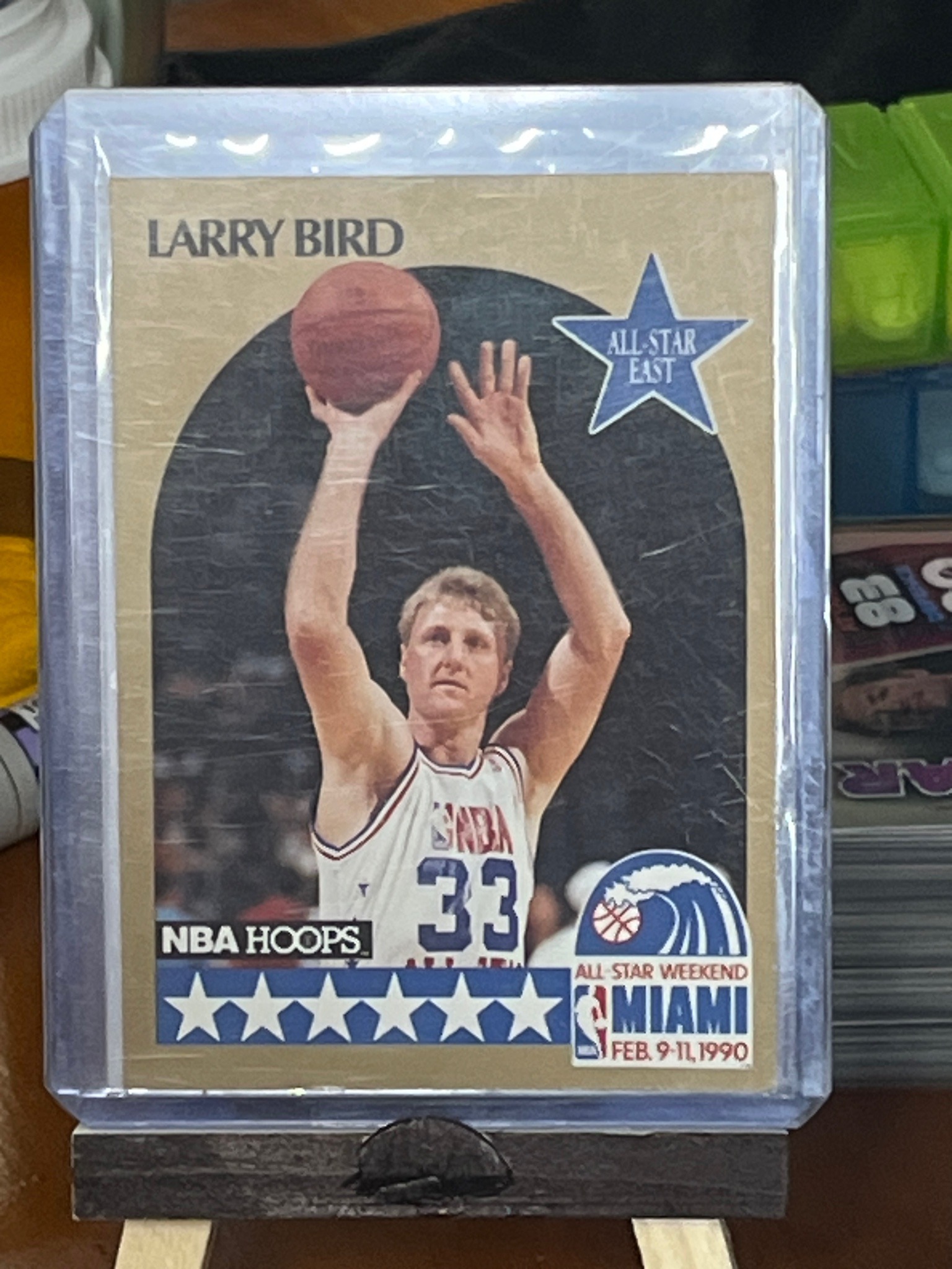This is a vintage 1990-91 NBA Hoops basketball card featuring Boston Celtics legend Larry Bird in his Eastern Conference All-Star uniform. The card commemorates the 1990 All-Star Weekend held in Miami, Florida. Physically, the card features a distinctive gold-bordered design characteristic of the NBA Hoops 'All-Star' subset, with an arched action photograph of Bird in his shooting motion. The front includes the player's name in bold black text at the top left, a blue 'All-Star East' star logo, and a detailed 1990 Miami All-Star logo at the bottom right. A blue stripe with white stars runs across the bottom of the image area. Based on the visual inspection inside its protective plastic top-loader and sleeve, the card appears to be in good condition with sharp corners and decent centering, though minor surface scratches are visible on the protective case rather than the card itself. This card was mass-produced by SkyBox International during the early 1990s 'junk wax' era, which generally impacts its rarity, yet Larry Bird remains a high-demand subject for collectors. The printing quality shows the standard halftone dot pattern of early 90s lithography.