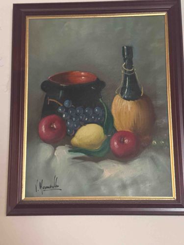 This is a rectangular oil painting on canvas or board, presented in a traditional dark wood-toned frame with a gold-leaf inner fillet. The composition is a classic still life featuring a collection of items against a muted, neutral grey-green background. Centrally located are two red apples, a bright yellow lemon, and a cluster of deep purple grapes, all arranged on a white draped cloth that shows subtle blue and grey shadow work. Behind the fruit sits a large, black-glazed ceramic vessel with a distinctive terracota-red interior, and a traditional straw-wrapped wine bottle (fiasco). The brushwork is impressionistic yet deliberate, showing a mid-20th-century aesthetic. A clear signature is visible in the lower-left corner, likely 'V. Musante' or similar, executed in dark script. Regarding condition, the artwork appears well-preserved with no immediate signs of flaking or craquelure, although the frame shows minor age-related wear. The lighting and shadows suggest a single-source light from the upper left, providing depth and volume to the objects. The craftsmanship reflects a skilled amateur or commercial artist of the mid-century period, utilizing a rich color palette and balanced spatial arrangement.