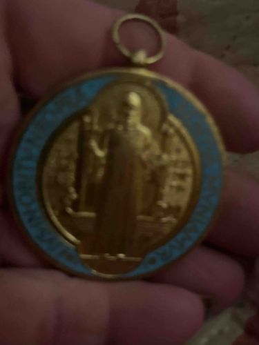 This is a circular, gold-toned religious medal, likely constructed from brass or gold-plated base metal, featuring the likeness of Saint Benedict of Nursia. The obverse depicts Saint Benedict holding a cross in his right hand and the Holy Rule in his left. He is positioned within a central architectural alcove, flanked by a cup and a raven seated on a pedestal. A distinctive band of light blue enamel encircles the central figure, containing the Latin inscription 'EJUS IN OBITU NOSTRO PRAESENTIA MUNIAMUR' (May we be strengthened by his presence in the hour of our death). The medal includes a built-in suspension loop and a jump ring at the top for attachment to a chain or rosary. Its design follows the official Jubilee Medal of Montecassino, first struck in 1880. Stylistically, this piece appears to be a 20th-century devotional item. The condition shows moderate wear to the raised relief, some darkening or patina on the metal surfaces, and minor pitting, though the blue enamel remains largely intact. The craftsmanship is standard for religious souvenirs, with cast details and applied enamel coloring.