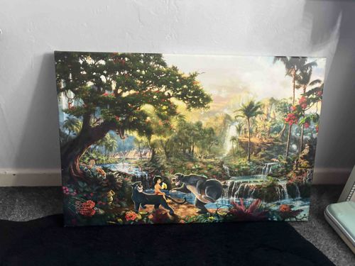 This item is a canvas art print from the 'Disney Dreams Collection' by Thomas Kinkade Studios, titled 'The Jungle Book.' The artwork portrays a lush, vibrant jungle scene featuring iconic characters Mowgli, Bagheera, and Baloo in the foreground. Consistent with the Kinkade 'Painter of Light' style, the piece utilizes a rich palette of deep greens, earthy browns, and brilliant highlights where sunlight filters through the dense canopy and reflects off cascading waterfalls. The composition is highly detailed, including hidden 'Easter egg' characters from the film scattered throughout the foliage. This specific piece appears to be a gallery-wrapped canvas, meaning the image continues around the edges of the wooden stretcher bars, eliminating the need for a frame. It likely features a protective UV-resistant coating. The bottom left corner displays the 'Thomas Kinkade Studios' official logo/insignia. In terms of condition, the canvas surface appears taut and free of major punctures or scratches, though slight edge wear may be present from handling. As part of the Disney collaboration series initiated in the late 2000s, this contemporary piece represents a popular intersection of fine art aesthetic and commercial animation history, typically produced as either an open edition or a limited edition lithograph on canvas.