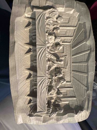 This item is a rectangular relief sculpture depicting the iconic biblical scene of the Last Supper, based on Leonardo da Vinci's famous composition. The piece is crafted from what appears to be a cast compound stone or gypsum cement, featuring a monochromatic light gray or off-white finish. The relief displays significant depth, with the figures of Jesus and the twelve apostles clearly defined along the long banquet table. The background includes architectural details like paneled walls and a coffered ceiling, providing a sense of linear perspective. The border of the piece has a rough, chiseled texture designed to mimic natural raw stone edges. Structurally, the plaque shows signs of minor surface dust and localized staining/patina consistent with display in a domestic environment. There are no visible major cracks or large chips, although the high-relief elements are susceptible to such damage. This particular style of religious devotional art became highly popular in the mid-to-late 20th century as home decor. The craftsmanship indicates a mass-produced cast rather than a hand-carved original, though the mold used was detailed, capturing the emotional gestures and folds in the drapery of the figures. This item is likely from the 1970s or 1980s, designed for wall mounting.