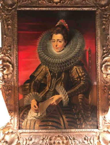This is a formal oil-on-canvas portrait depicting a noblewoman in Spanish or Flemish attire, executed in the Baroque style typical of the early 17th century. The subject is shown three-quarter length, seated in a high-backed chair against a deep crimson background. She wears an exceptionally large, intricate lace millstone ruff (fraise) and matching lace cuffs. Her bodice and skirt are meticulously detailed with gold metallic embroidery and brocade, suggesting high social status. She holds a small letter or document in her lap. The painting is housed in a heavy, ornate gilt-wood frame featuring high-relief rocaille, shell motifs, and scrolling acanthus leaves, likely of a later date (19th century) than the painting's stylistic period. Physical observation reveals a stable craquelure pattern across the paint surface, particularly visible in the flesh tones and the dark areas of the dress. There appears to be some minor surface abrasions and a slightly yellowed varnish layer. The frame shows some dust accumulation in the deep carvings and minor loss to the gilding on the high points, revealing the reddish bole or gesso beneath. The craftsmanship in the rendering of the lace and the reflective quality of the metallic threads indicates a skilled hand, though no visible signature is apparent on the face of the canvas. The overall composition and lighting reflect the influence of court painters like Rubens or Velázquez.