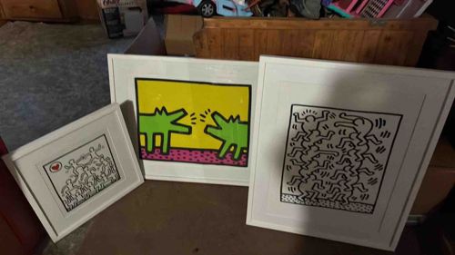 This is a set of three framed art prints featuring the iconic Pop Art style associated with Keith Haring. The collection consists of one small rectangular landscape-oriented print and two larger square-profile prints. The center piece features a vibrant color palette with two lime-green 'barking dogs' facing each other against a saturated yellow background and a pink-and-purple speckled floor. The two flanking pieces are black-and-white line drawings characteristic of Haring's street art origins: the leftmost piece depicts a pyramid of human figures with a single small red heart detail at the top, and the rightmost piece shows a dense vertical stack of dancing figures. All three prints are housed in uniform, modern white gallery-style frames with thick white mats and protective glazing, likely acrylic or glass. The bold, thick black outlines and kinetic motion lines are hallmark indicators of late 20th-century New York subway art influence. The frames appear to be in good condition with crisp edges, though there is a noticeable shadow cast over the rightmost frame. From the visual evidence, these appear to be high-quality contemporary commercial reproductions or exhibition prints rather than original unique works on canvas, given their uniform presentation and printed nature. The craftsmanship of the framing suggests they were intended for domestic decorative use or a gallery shop collection.