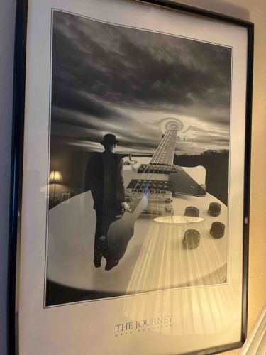 This is a monochrome, surrealist framed art print titled "The Journey," created by artist Gwen Morrison. The composition features a conceptual landscape where the primary foreground element is a large, white electric guitar body (appearing to be a Gibson Les Paul style). On the surface of the guitar walks a diminutive male figure dressed in a dark suit and hat, seen from behind, carrying a guitar case as he walks toward the headstock which extends into a dramatic, cloudy horizon. The print is monochrome, utilizing a range of grays, blacks, and whites to create a moody, atmospheric effect. The size appears to be a standard large poster format, approximately 24x36 inches, housed in a thin, black metallic or wooden frame with a white over-mat. The bottom of the print features the title 'THE JOURNEY' in a serif font with the artist's name 'GWEN MORRISON' underneath. The condition appears good from the photo, with no visible foxing, water damage, or fading, though there is a prominent reflection of a domestic lamp on the glass. The style is late 20th-century contemporary surrealism, likely produced as a mass-market art print or interior decor piece. The craftsmanship of the print suggests a commercial lithograph quality with clean typography and sharp photographic contrast.