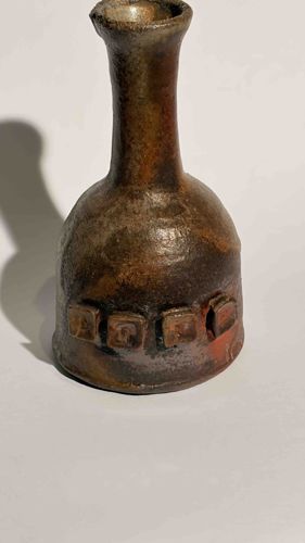 This is a hand-thrown studio pottery stoneware vessel, likely functioning as a weed pot or decorative bottle. The piece features a bulbous body that tapers into a long, slender neck with a flared, rustic rim. The construction is heavy and earthy, utilizing a stoneware clay body finished with a rich, varied glaze appearing in shades of metallic iron, charcoal, and deep umber, likely achieved through reduction firing or a wood-firing process. Around the mid-section of the base are four distinctive raised square applications, each impressed with a single letter to spell 'DOPE,' adding a provocative counter-culture or Brutalist aesthetic. The surface displays a mottled, textured patina with areas of orange-red flashing and a slightly metallic sheen. Condition-wise, the piece shows characteristic irregularities of handmade pottery, including minor pitting and an organically uneven rim, though no major chips or cracks are visible in the primary structure. The bottom is reported to bear an 'EF' mark with a shamrock/clover stamp, identifying the specific studio potter or workshop. Its style suggests mid-to-late 20th-century California studio pottery influence, combining traditional pottery techniques with bold, graphic elements typical of folk-art revivalism.